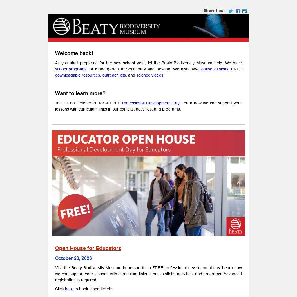 Visit the Beaty Biodiversity Museum in person for a FREE professional development day. Learn how we can support your lessons with curriculum links in our exhibits, activities, and programs. Advanced registration is required!