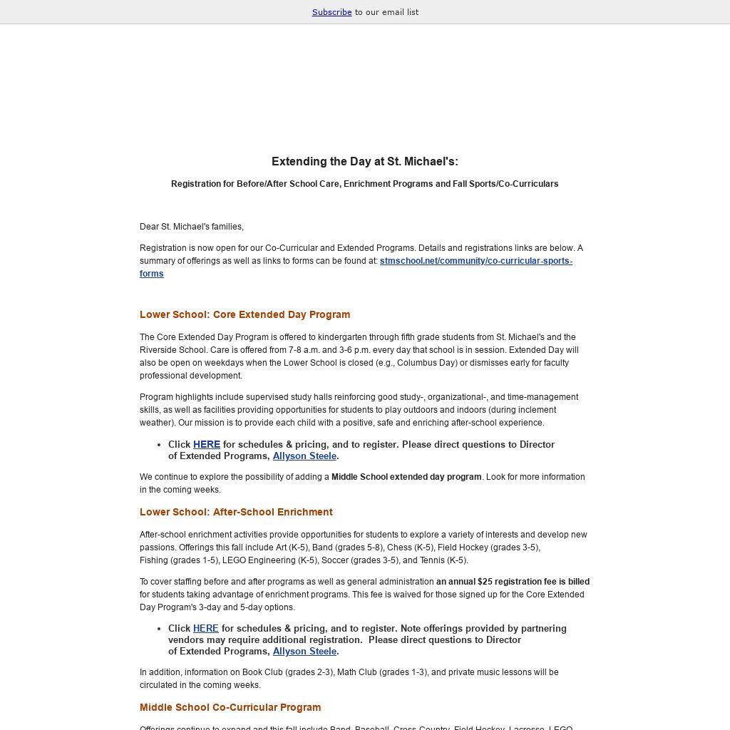 Registration is now open for our Co-Curricular and Extended Programs. Details and registrations links are below. A summary of offerings as well as links to forms can be found at: stmschool.net/community/co-curricular-sports-forms