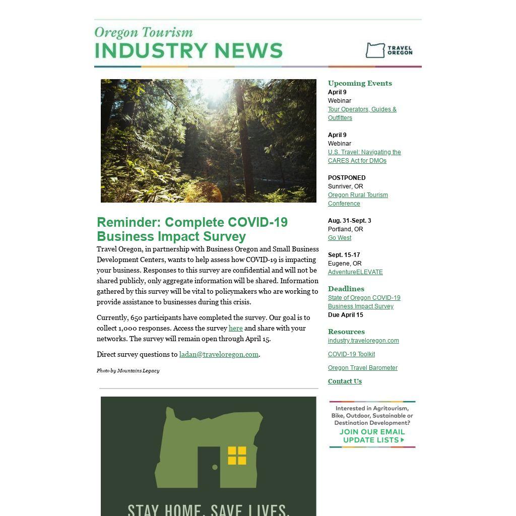 Travel Oregon, in partnership with Business Oregon and Small Business Development Centers, wants to help assess how COVID-19 is impacting your business. Responses to this survey are confidential and will not be shared publicly, only aggregate information will be shared. Information gathered by this survey will be vital to policymakers who are working to provide assistance to businesses during this crisis.