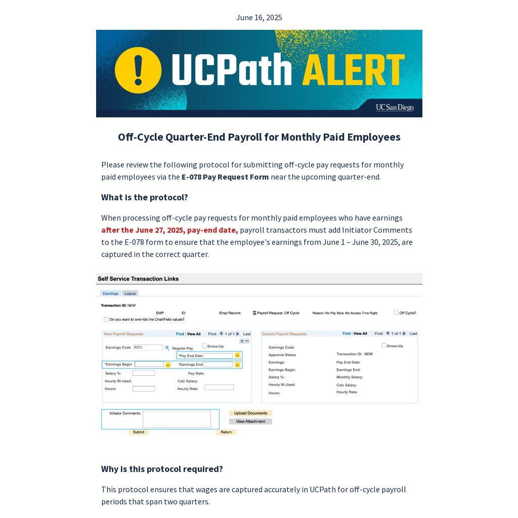 When processing off-cycle pay requests for monthly paid employees who have earnings after the June 27, 2025, pay-end date, payroll transactors must add Initiator Comments to the E-078 form to ensure that the employee's earnings from June 1 – June 30, 2025, are captured in the correct quarter.