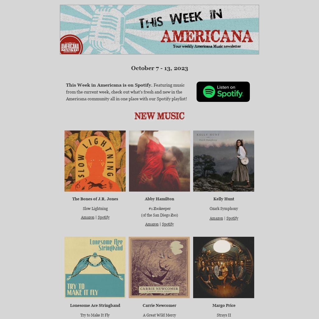 This Week in Americana is on Spotify. Featuring music from the current week, check out what's fresh and new in the Americana community all in one place with our Spotify playlist!