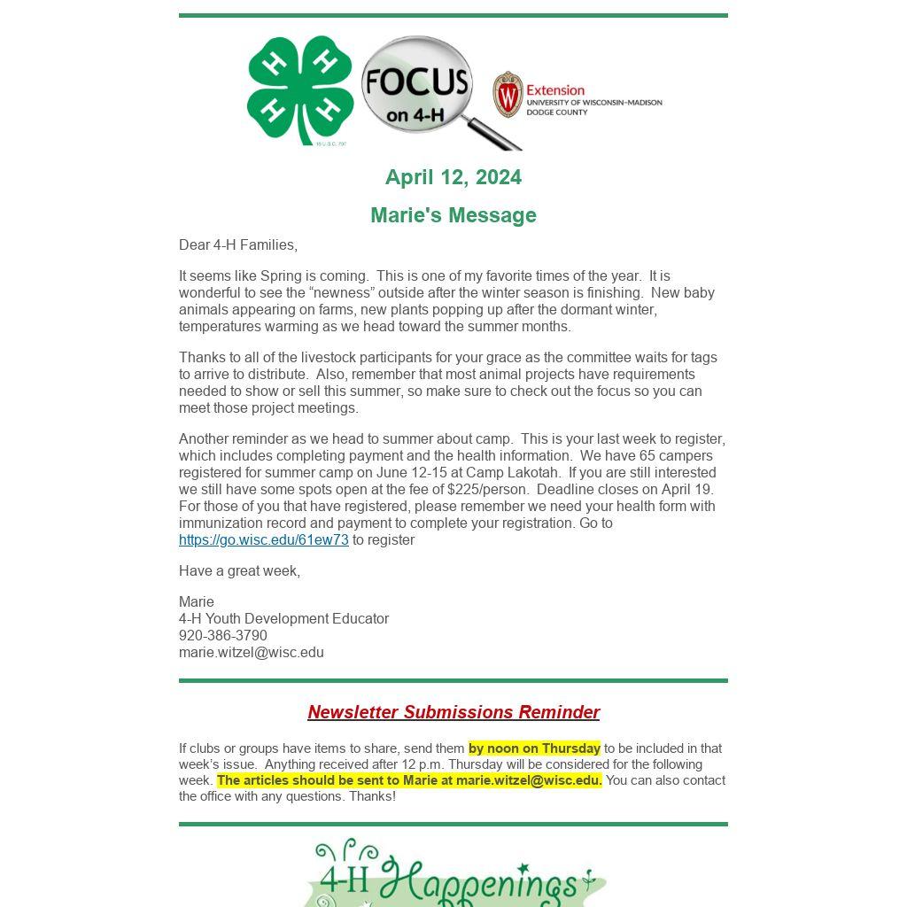 If clubs or groups have items to share, send them by noon on Thursday to be included in that week’s issue. Anything received after 12 p.m. Thursday will be considered for the following week. The articles should be sent to Marie at marie.witzel@wisc.edu. You can also contact the office with any questions. Thanks!