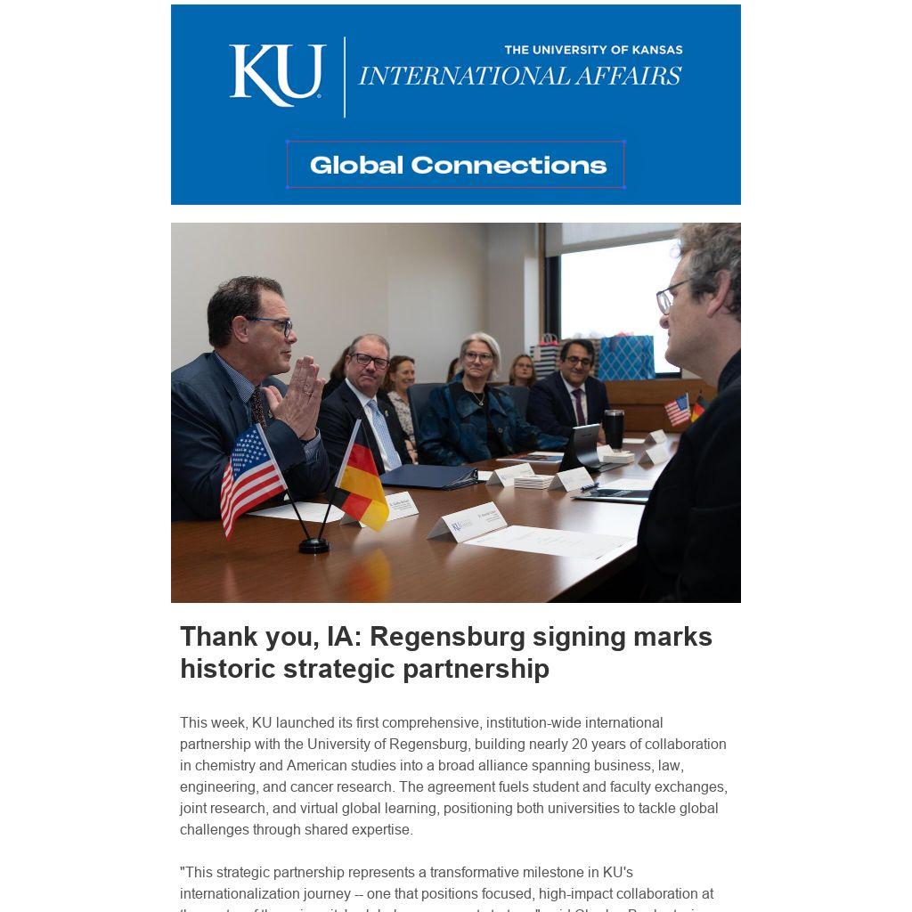 This week, KU launched its first comprehensive, institution-wide international partnership with the University of Regensburg, building nearly 20 years of collaboration in chemistry and American studies into a broad alliance spanning business, law, engineering, and cancer research. The agreement fuels student and faculty exchanges, joint research, and virtual global learning, positioning both universities to tackle global challenges through shared expertise.