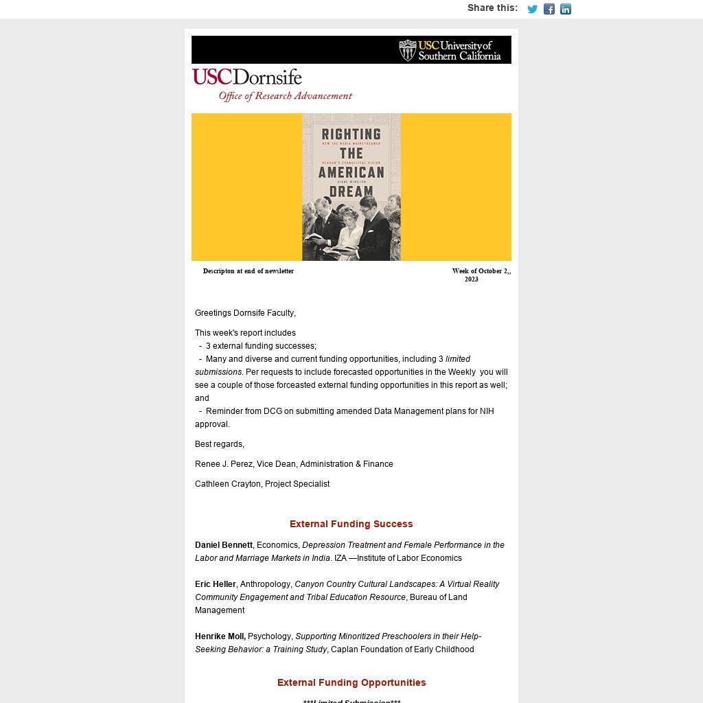 This week's report includes - 3 external funding successes; - Many and diverse and current funding opportunities, including 3 limited submissions. Per requests to include forecasted opportunities in the Weekly you will see a couple of those forceasted external funding opportunities in this report as well; and - Reminder from DCG on submitting amended Data Management plans for NIH approval.