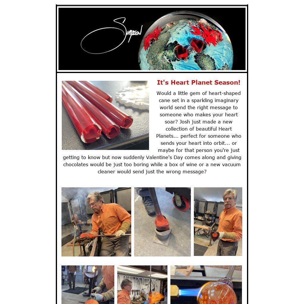 Would a little gem of heart-shaped cane set in a sparkling imaginary world send the right message to someone who makes your heart soar? Josh just made a new collection of beautiful Heart Planets... perfect for someone who sends your heart into orbit... or maybe for that person you're just getting to know but now suddenly Valentine's Day comes along and giving chocolates would be just too boring while a box of wine or a new vacuum cleaner would send just the wrong message?