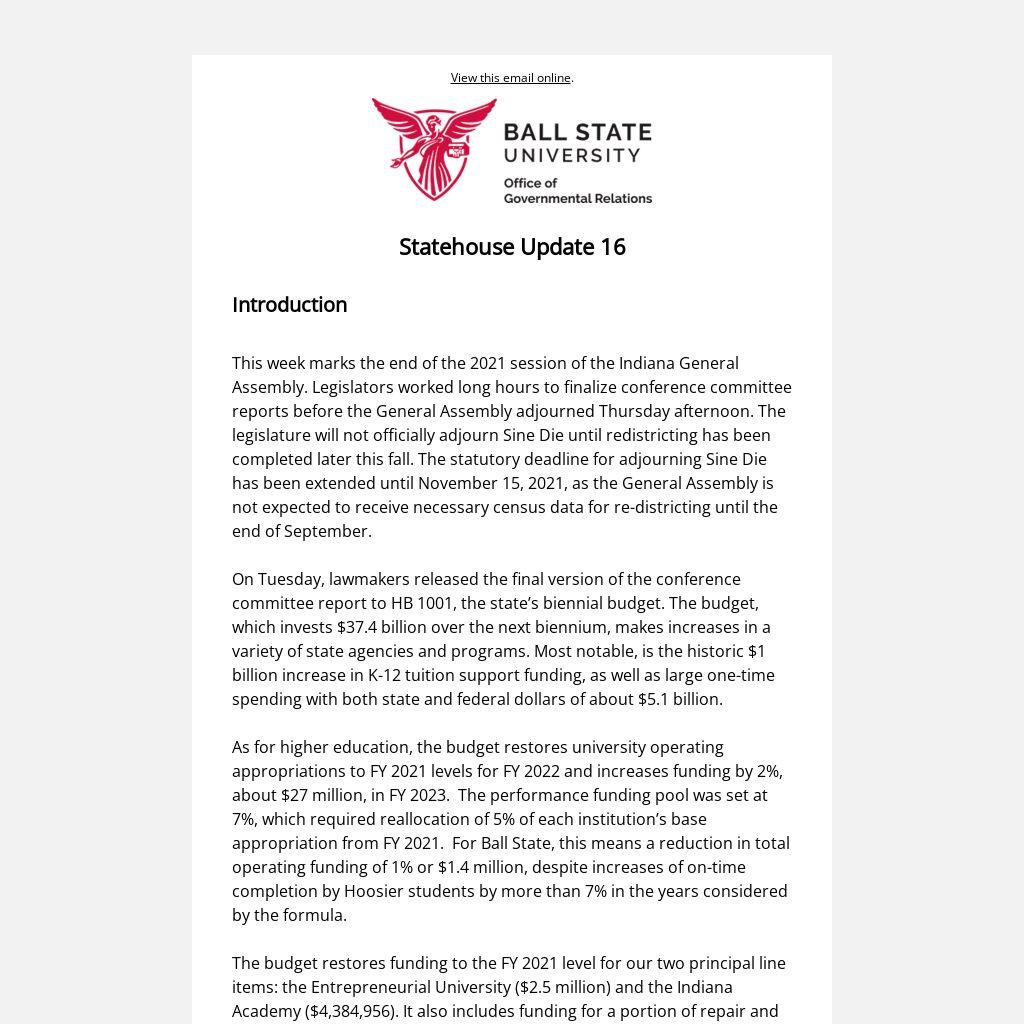 The Governmental Relations team would like to thank you for the support, assistance, and expertise provided during the 2021 legislative session. It is a pleasure to represent Ball State University at the Statehouse and to share all the great things happening at our institutions with our lawmakers. The good work that happens on campus creates a great deal of goodwill with our policymakers and is recognized at the Statehouse.
