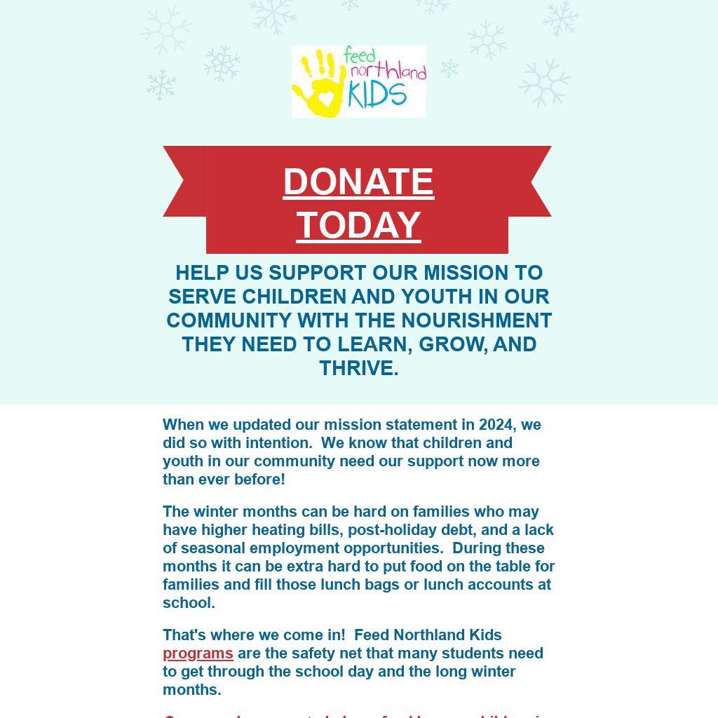 That's where we come in! Feed Northland Kids programs are the safety net that many students need to get through the school day and the long winter months. |