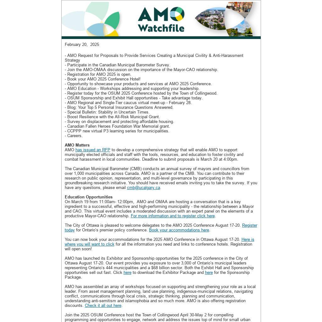 AMO has issued an RFP to develop a comprehensive strategy that will enable AMO to support municipally elected officials and staff with the tools, resources, and education to foster civility and combat harassment in local communities. Deadline to submit proposals is March 20 at 4:00pm.