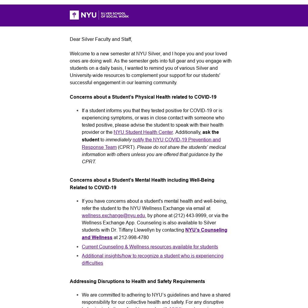 Welcome to a new semester at NYU Silver, and I hope you and your loved ones are doing well. As the semester gets into full gear and you engage with students on a daily basis, I wanted to remind you of various Silver and University-wide resources to complement your support for our students' successful engagement in our learning community.