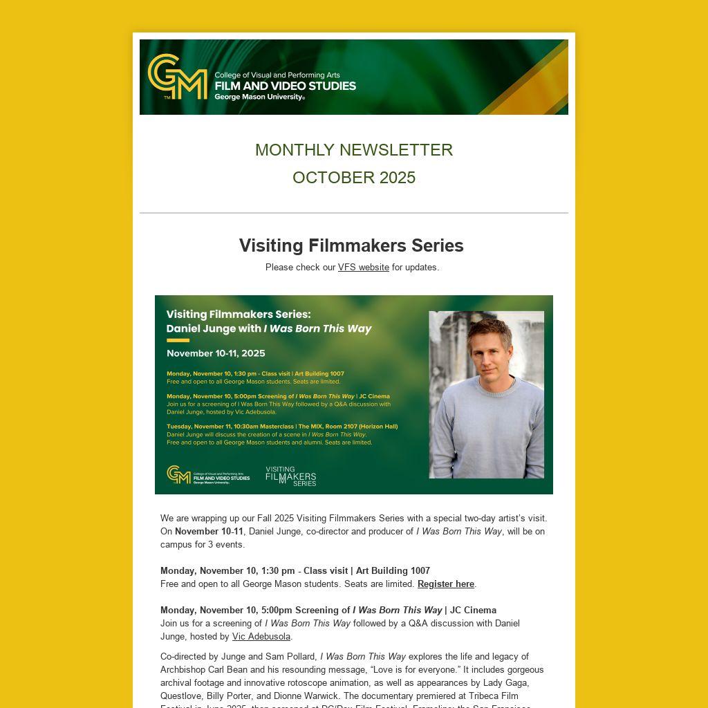 We are wrapping up our Fall 2025 Visiting Filmmakers Series with a special two-day artist’s visit. On November 10-11, Daniel Junge, co-director and producer of I Was Born This Way, will be on campus for 3 events. Monday, November 10, 1:30 pm - Class visit | Art Building 1007 Free and open to all George Mason students. Seats are limited. Register here.