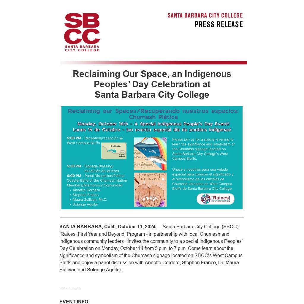 SANTA BARBARA, Calif., October 11, 2024 — Santa Barbara City College (SBCC) iRaices: First Year and Beyond! Program - in partnership with local Chumash and Indigenous community leaders - invites the community to a special Indigenous Peoples’ Day Celebration on Monday, October 14 from 5 p.m. to 7 p.m. Come learn about the significance and symbolism of the Chumash signage located on SBCC’s West Campus Bluffs and enjoy a panel discussion with Annette Cordero, Stephen Franco, Dr. Maura Sullivan and Solange Aguilar.
