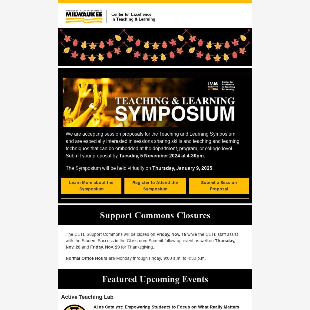 The CETL Support Commons will be closed on Friday, Nov. 15 while the CETL staff assist with the Student Success in the Classroom Summit follow-up event as well on Thursday, Nov. 28 and Friday, Nov. 29 for Thanksgiving.