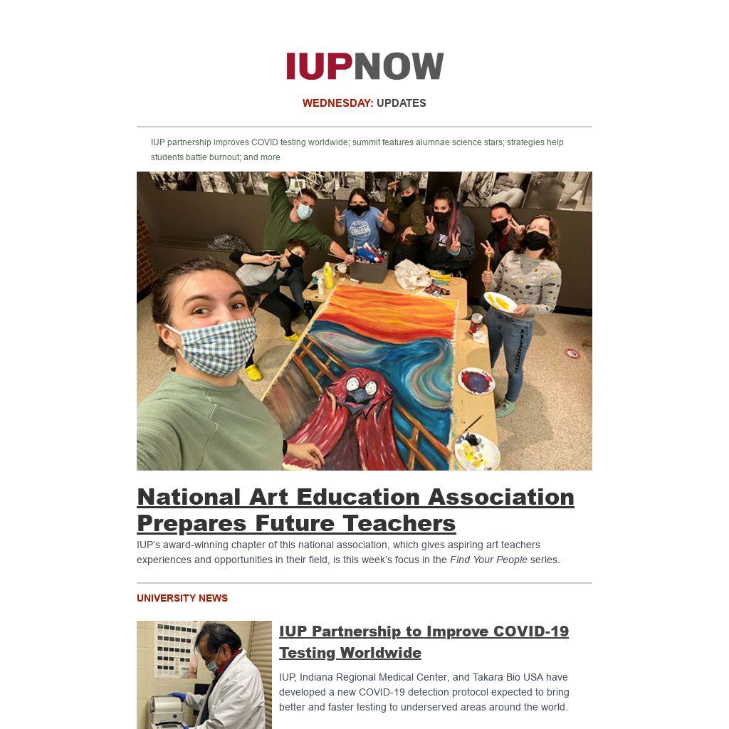 Distributed to IUP employees and students four days a week, IUP Now is the official newsletter of Indiana University of Pennsylvania. It features news from across the IUP website, compiled by the Division of Marketing and Communications. Find out how to get your news and events in IUP Now.