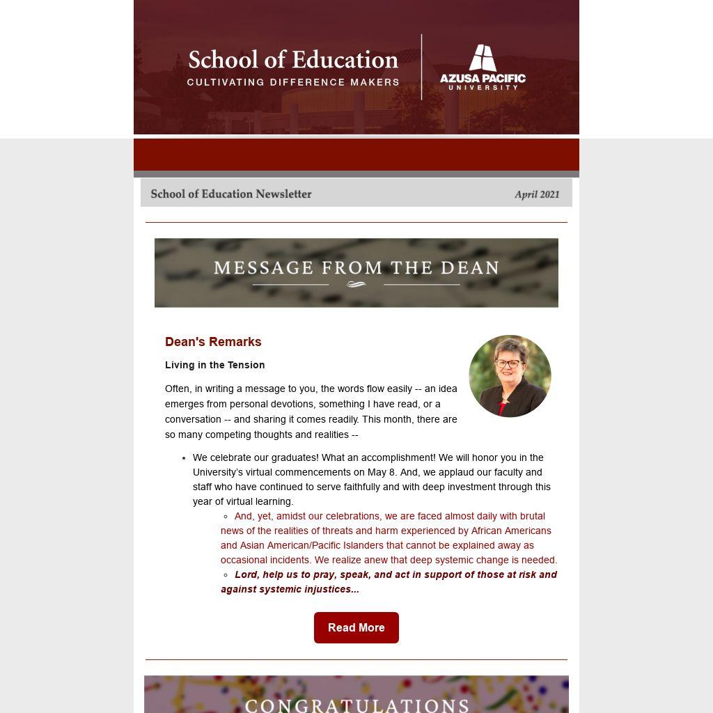 - We celebrate our graduates! What an accomplishment! We will honor you in the University’s virtual commencements on May 8. And, we applaud our faculty and staff who have continued to serve faithfully and with deep investment through this year of virtual learning.