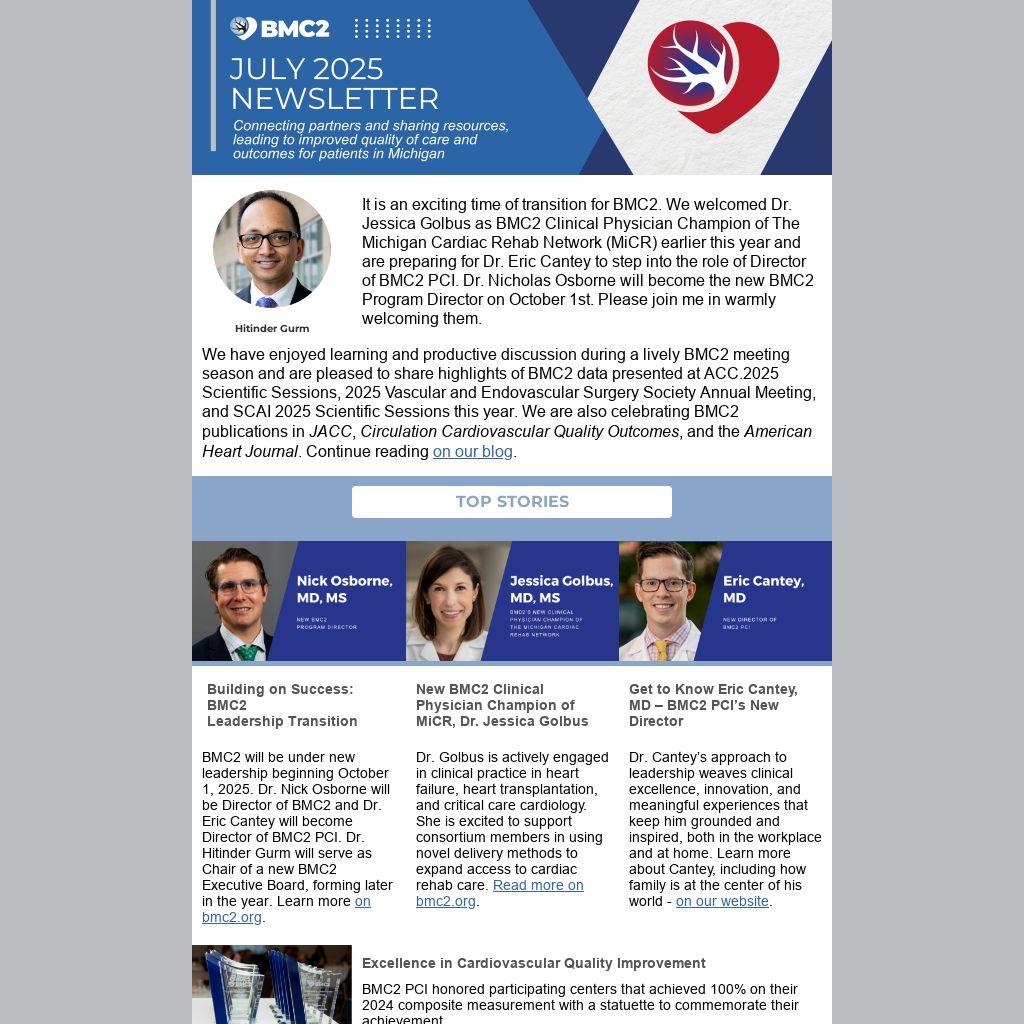 It is an exciting time of transition for BMC2. We welcomed Dr. Jessica Golbus as BMC2 Clinical Physician Champion of The Michigan Cardiac Rehab Network (MiCR) earlier this year and are preparing for Dr. Eric Cantey to step into the role of Director of BMC2 PCI. Dr. Nicholas Osborne will become the new BMC2 Program Director on October 1st. Please join me in warmly welcoming them.
