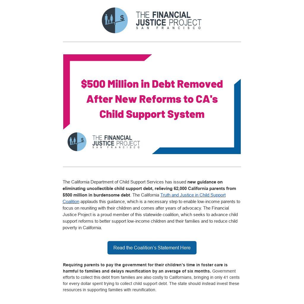 We thank the Truth and Justice in Child Support Coalition, California Senator Nancy Skinner, California Assemblymember Mia Bonta, the California Department of Child Support Services, and Governor Newsom for advancing these important reforms that will support families.
