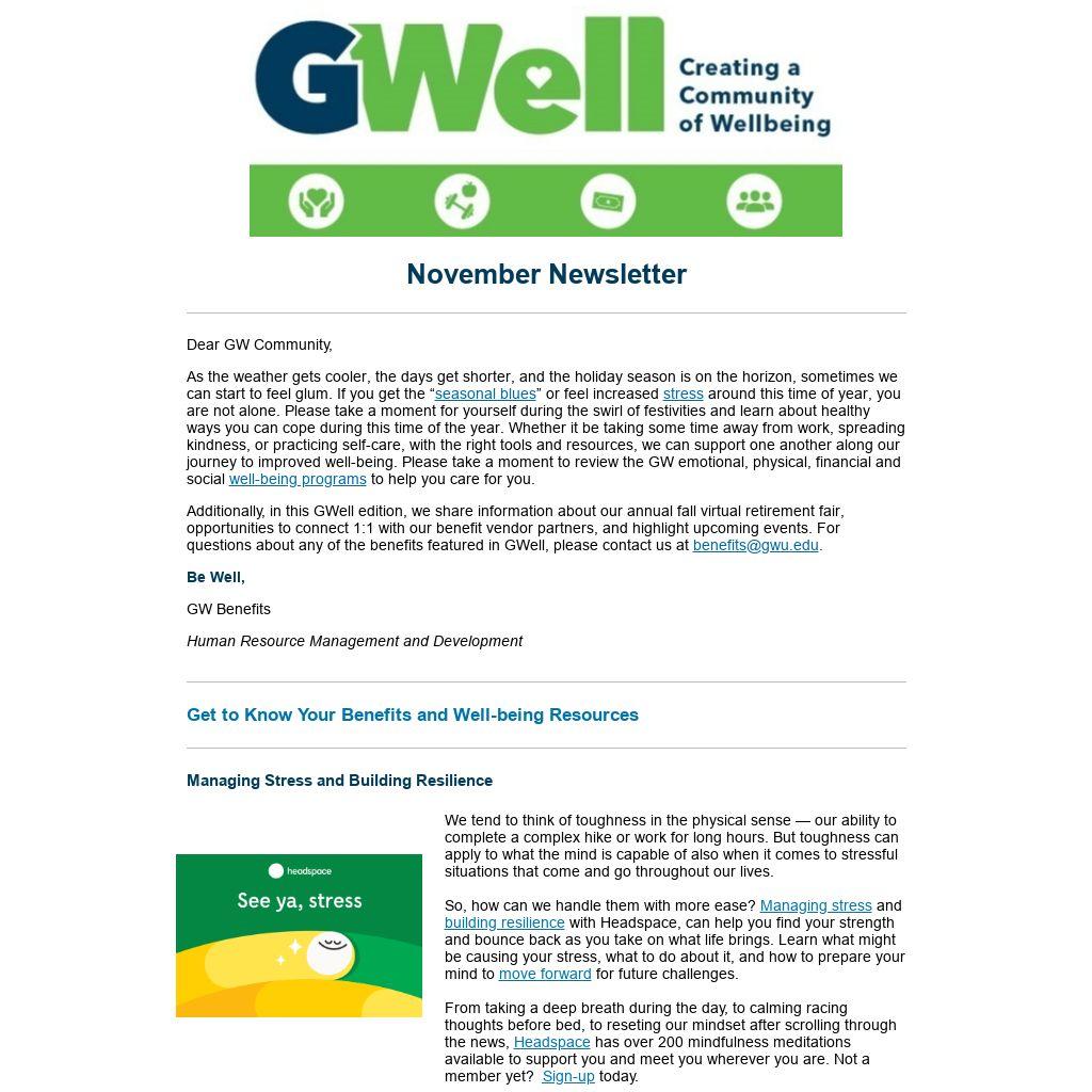 Additionally, in this GWell edition, we share information about our annual fall virtual retirement fair, opportunities to connect 1:1 with our benefit vendor partners, and highlight upcoming events. For questions about any of the benefits featured in GWell, please contact us at benefits@gwu.edu.
