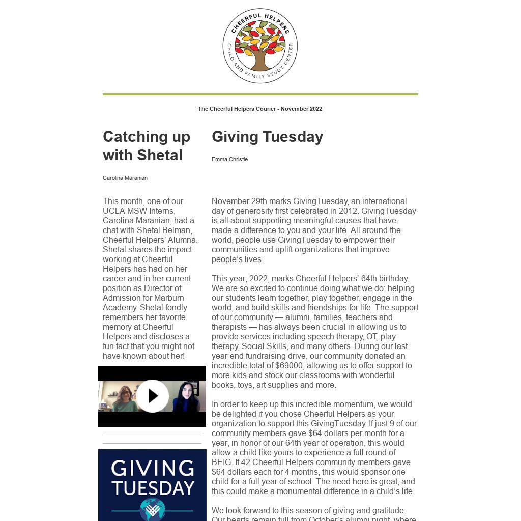 We look forward to this season of giving and gratitude. Our hearts remain full from October’s alumni night, where we heard our graduates’ wonderful stories of growth, community, and new directions. We are excited for another year of Cheerful Helpers, and a 2023 full of new faces in our programs.