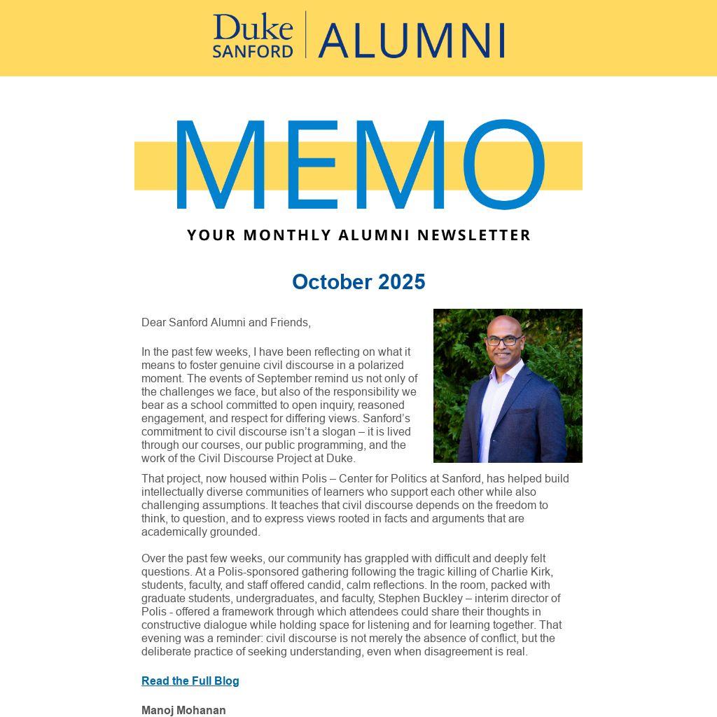 In the past few weeks, I have been reflecting on what it means to foster genuine civil discourse in a polarized moment. The events of September remind us not only of the challenges we face, but also of the responsibility we bear as a school committed to open inquiry, reasoned engagement, and respect for differing views. Sanford’s commitment to civil discourse isn’t a slogan – it is lived through our courses, our public programming, and the work of the Civil Discourse Project at Duke.