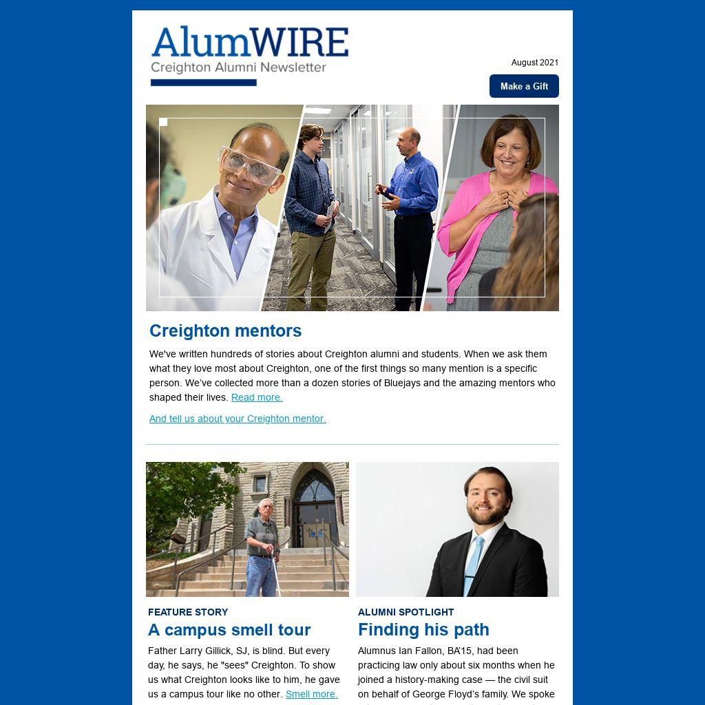 We've written hundreds of stories about Creighton alumni and students. When we ask them what they love most about Creighton, one of the first things so many mention is a specific person. We’ve collected more than a dozen stories of Bluejays and the amazing mentors who shaped their lives. Read more.