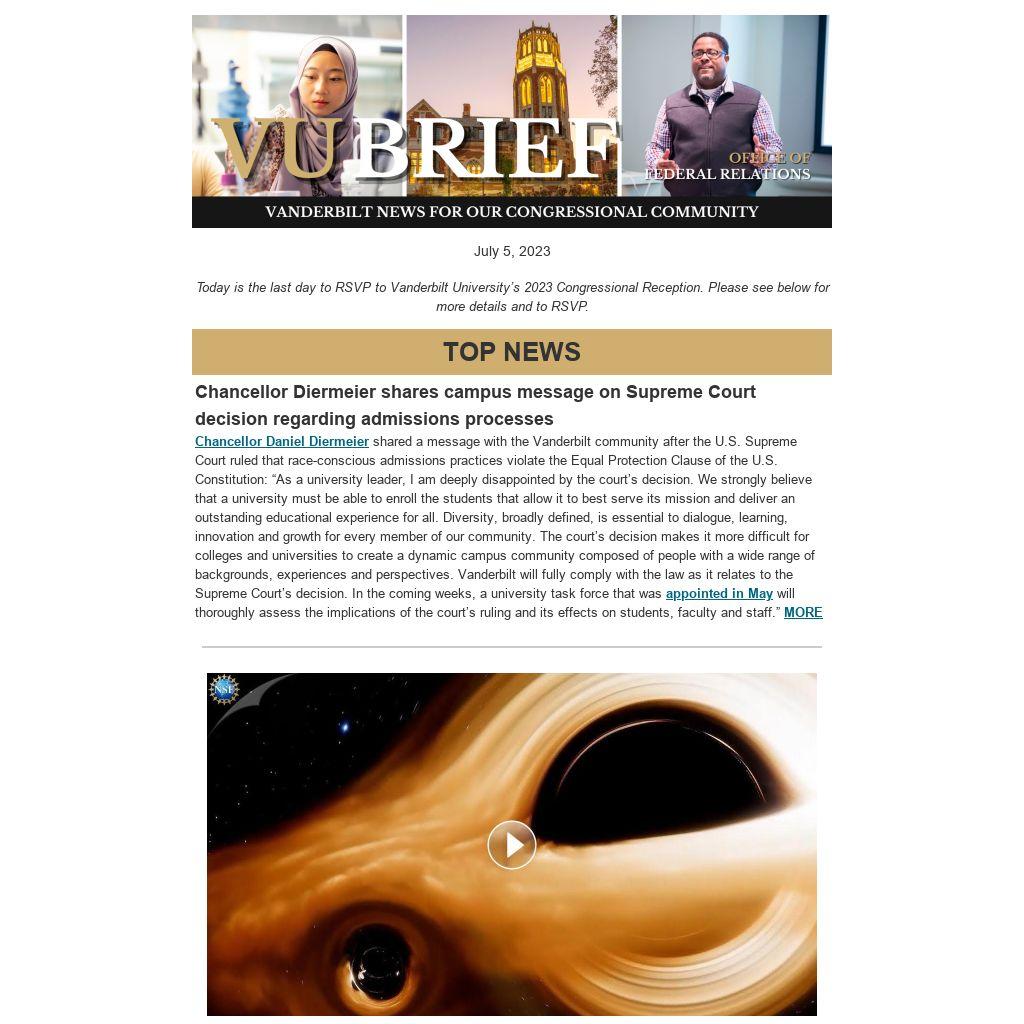 Chancellor Daniel Diermeier shared a message with the Vanderbilt community after the U.S. Supreme Court ruled that race-conscious admissions practices violate the Equal Protection Clause of the U.S. Constitution: “As a university leader, I am deeply disappointed by the court’s decision. We strongly believe that a university must be able to enroll the students that allow it to best serve its mission and deliver an outstanding educational experience for all. Diversity, broadly defined, is essential to dialogue, learning, innovation and growth for every member of our community. The court’s decision makes it more difficult for colleges and universities to create a dynamic campus community composed of people with a wide range of backgrounds, experiences and perspectives. Vanderbilt will fully comply with the law as it relates to the Supreme Court’s decision. In the coming weeks, a university task force that was appointed in May will thoroughly assess the implications of the court’s ruling and its effects on students, faculty and staff.” MORE