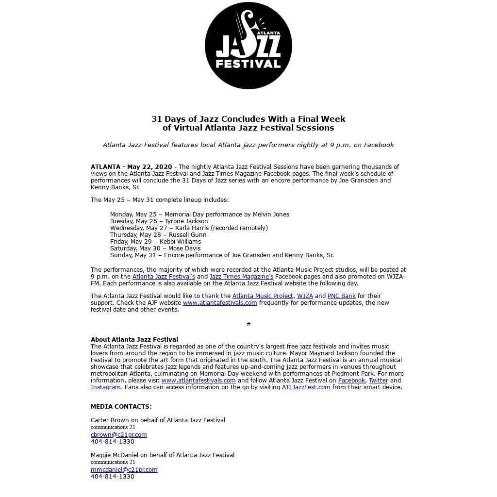 The Atlanta Jazz Festival would like to thank the Atlanta Music Project, WJZA and PNC Bank for their support. Check the AJF website www.atlantafestivals.com frequently for performance updates, the new festival date and other events.