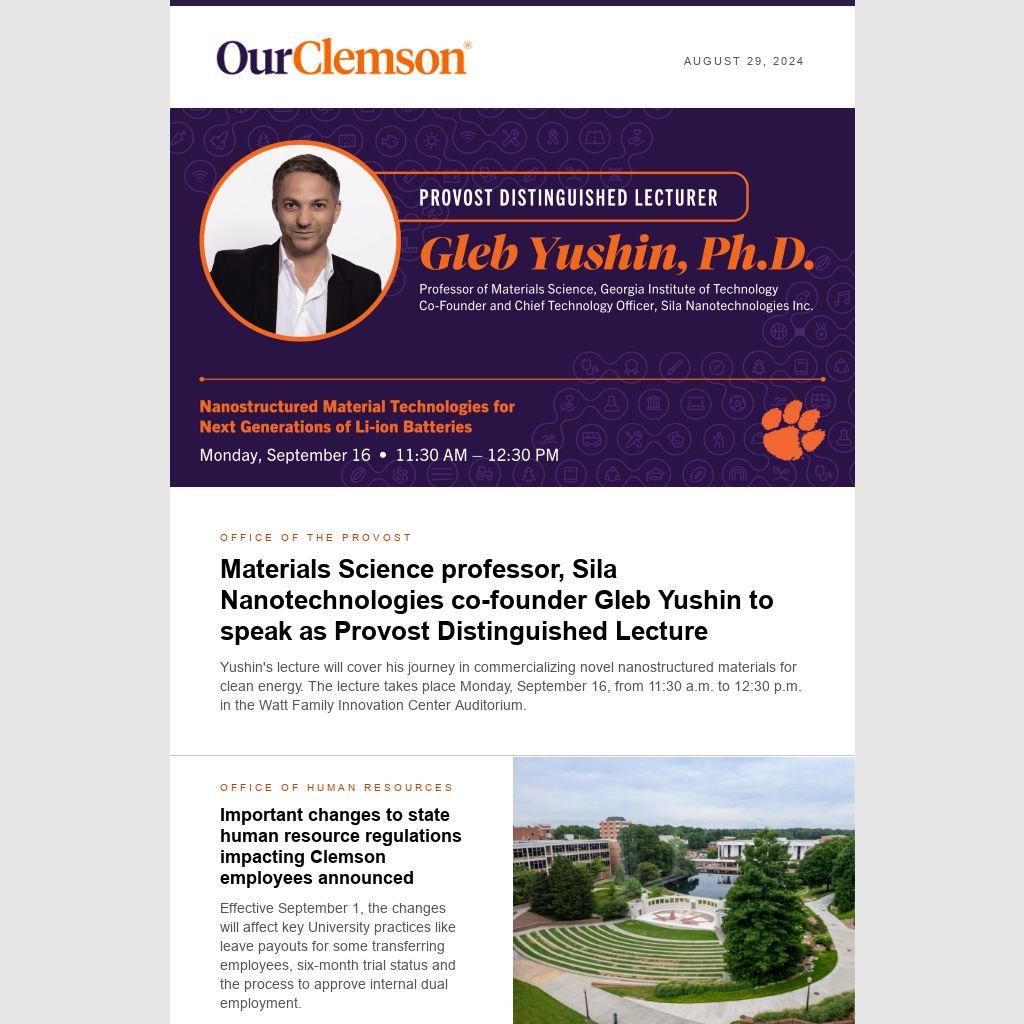 Yushin's lecture will cover his journey in commercializing novel nanostructured materials for clean energy. The lecture takes place Monday, September 16, from 11:30 a.m. to 12:30 p.m. in the Watt Family Innovation Center Auditorium.