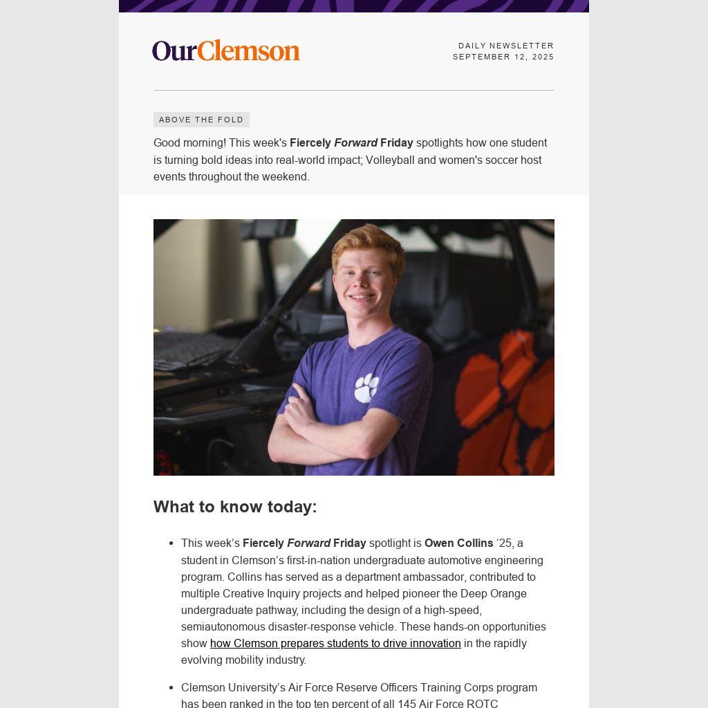 This week’s Fiercely Forward Friday spotlight is Owen Collins ‘25, a student in Clemson’s first-in-nation undergraduate automotive engineering program. Collins has served as a department ambassador, contributed to multiple Creative Inquiry projects and helped pioneer the Deep Orange undergraduate pathway, including the design of a high-speed, semiautonomous disaster-response vehicle. These hands-on opportunities show how Clemson prepares students to drive innovation in the rapidly evolving mobility industry.