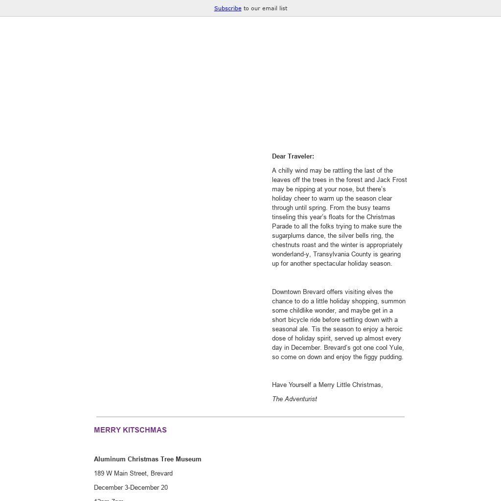 Dear Traveler: A chilly wind may be rattling the last of the leaves off the trees in the forest and Jack Frost may be nipping at your nose, but there’s holiday cheer to warm up the season clear through until spring. From the busy teams tinseling this year’s floats for the Christmas Parade to all the folks trying to make sure the sugarplums dance, the silver bells ring, the chestnuts roast and the winter is appropriately wonderland-y, Transylvania County is gearing up for another spectacular holiday season.