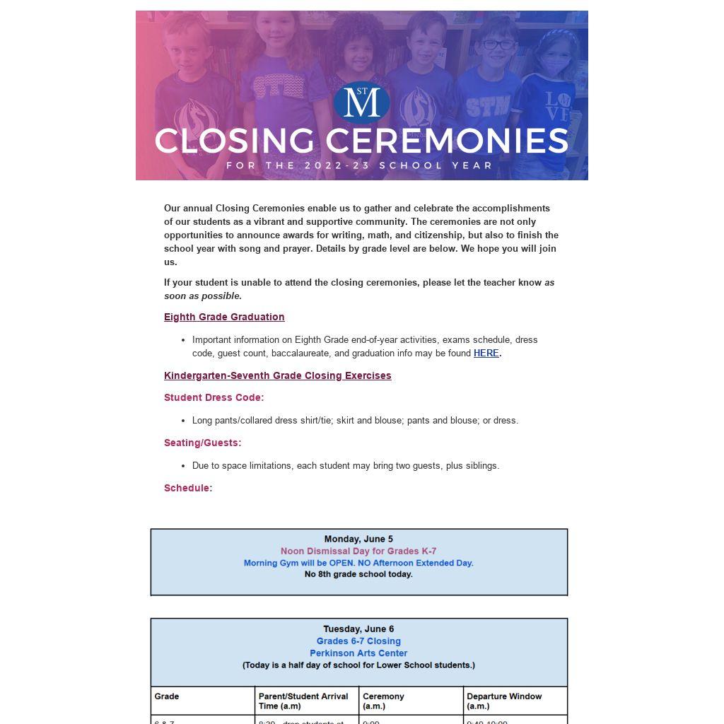 Our annual Closing Ceremonies enable us to gather and celebrate the accomplishments of our students as a vibrant and supportive community. The ceremonies are not only opportunities to announce awards for writing, math, and citizenship, but also to finish the school year with song and prayer. Details by grade level are below. We hope you will join us.