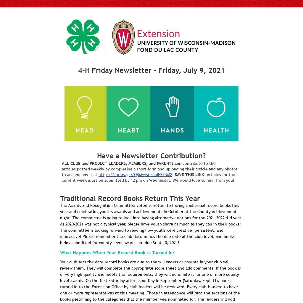 Traditional Record Books Return This YearThe Awards and Recognition Committee voted to return to having traditional record books this year and celebrating youth's awards and achievements in October at the County Achievement night. The committee is going to look into having alternative options for the 2021-2022 4-H year. As 2020-2021 was not a typical year, please have youth share as much as they can in their books! The committee is looking forward to reading how youth were creative, persistent, and innovative! Please remember the club determines the due date at the club level, and books being submitted for county-level awards are due Sept 10, 2021!