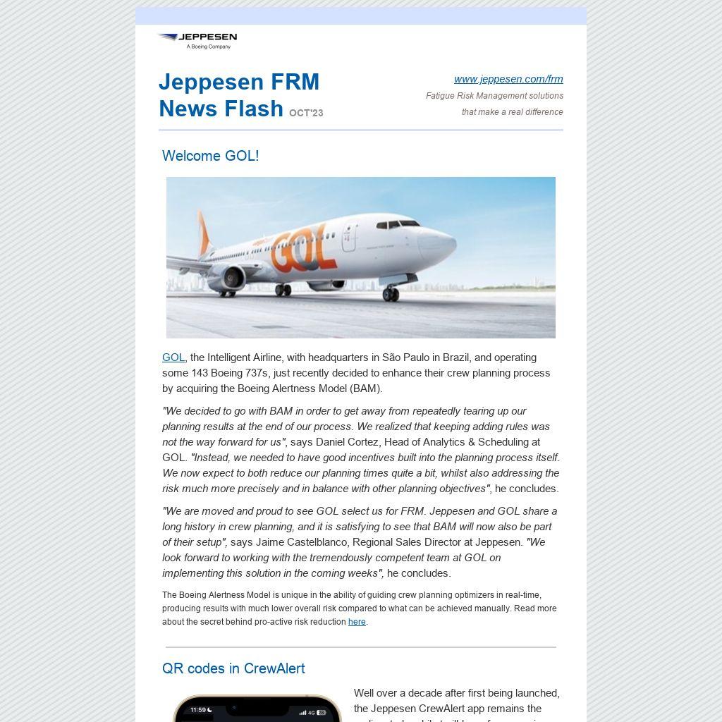 "We are moved and proud to see GOL select us for FRM. Jeppesen and GOL share a long history in crew planning, and it is satisfying to see that BAM will now also be part of their setup", says Jaime Castelblanco, Regional Sales Director at Jeppesen. "We look forward to working with the tremendously competent team at GOL on implementing this solution in the coming weeks", he concludes.