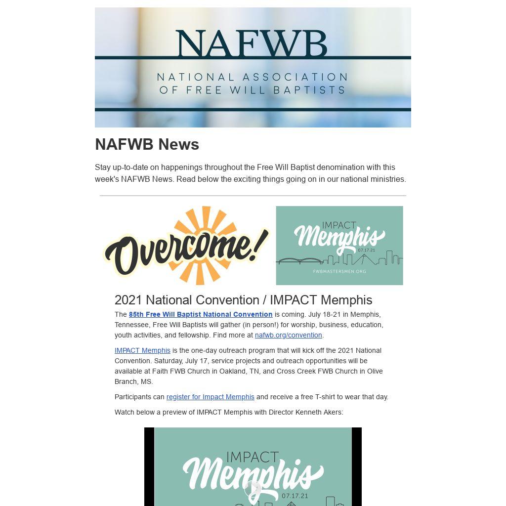 Convention Prayer UpdatesThe TNFWB IM Board will serve as the Prayer Committee for the 2021 National Convention. We invite your prayers for the city of Memphis as the convention approaches. With thousands of Free Will Baptists converging on this wonderful city, we are asking our Father to use us to impact the whole region for His glory!