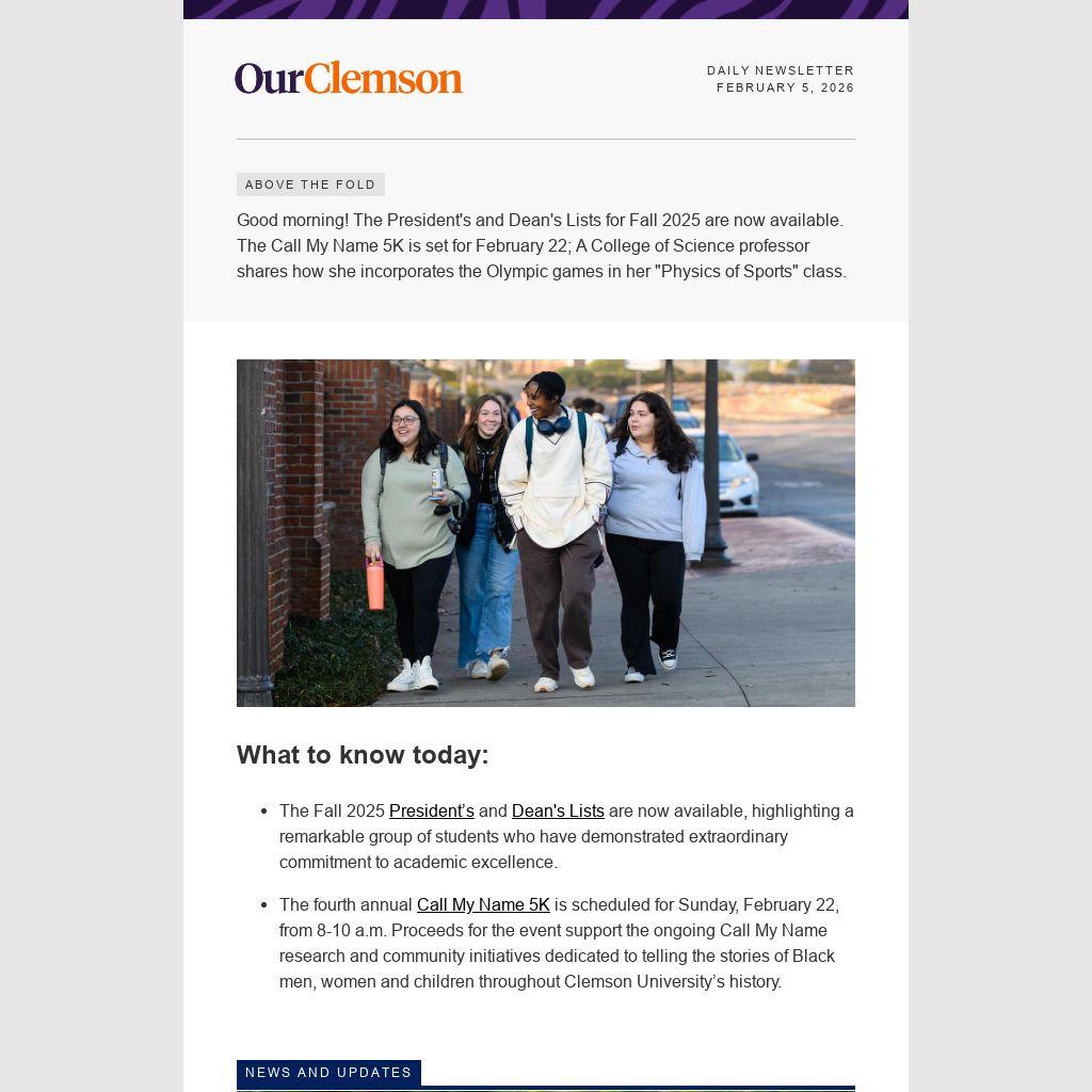 Good morning! The President's and Dean's Lists for Fall 2025 are now available. The Call My Name 5K is set for February 22; A College of Science professor shares how she incorporates the Olympic games in her "Physics of Sports" class.