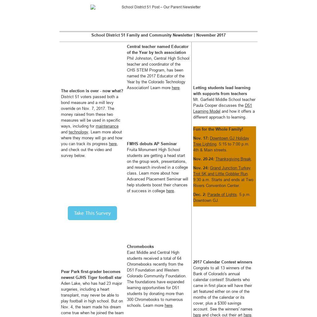 District 51 voters passed both a bond measure and a mill levy override on Nov. 7, 2017. The money raised from these two measures will be used in specific ways, including for maintenance and technology. Learn more about where they money will go and how you can track its progress here, and check out the video and survey below.