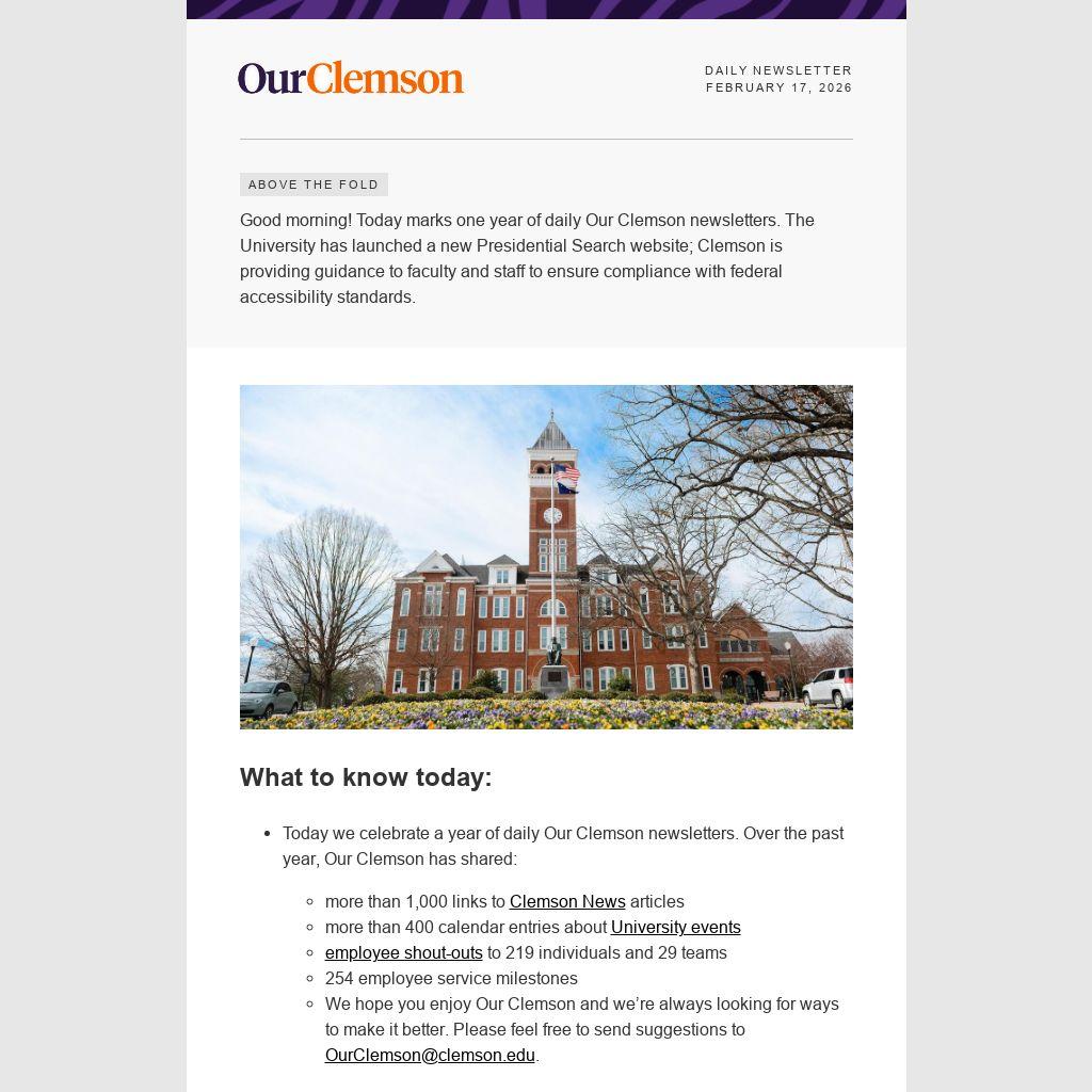 Good morning! Today marks one year of daily Our Clemson newsletters. The University has launched a new Presidential Search website; Clemson is providing guidance to faculty and staff to ensure compliance with federal accessibility standards.