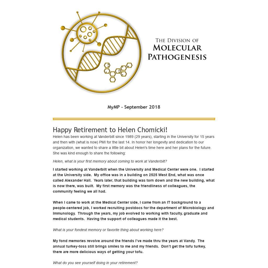 Happy Retirement to Helen Chomicki!Helen has been working at Vanderbilt since 1989 (29 years), starting in the University for 15 years and then with (what is now) PMI for the last 14. In honor her longevity and dedication to our organization, we wanted to share a little bit about Helen's time here and her plans for the future. She was kind enough to share the following: Helen, what is your first memory about coming to work at Vanderbilt?