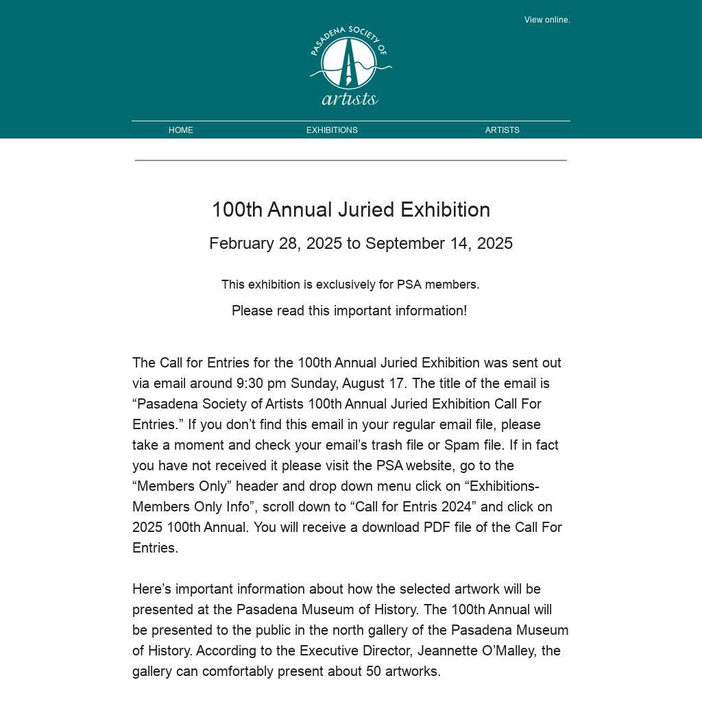 The Call for Entries for the 100th Annual Juried Exhibition was sent out via email around 9:30 pm Sunday, August 17. The title of the email is “Pasadena Society of Artists 100th Annual Juried Exhibition Call For Entries.” If you don’t find this email in your regular email file, please take a moment and check your email’s trash file or Spam file. If in fact you have not received it please visit the PSA website, go to the “Members Only” header and drop down menu click on “Exhibitions-Members Only Info”, scroll down to “Call for Entris 2024” and click on 2025 100th Annual. You will receive a download PDF file of the Call For Entries.