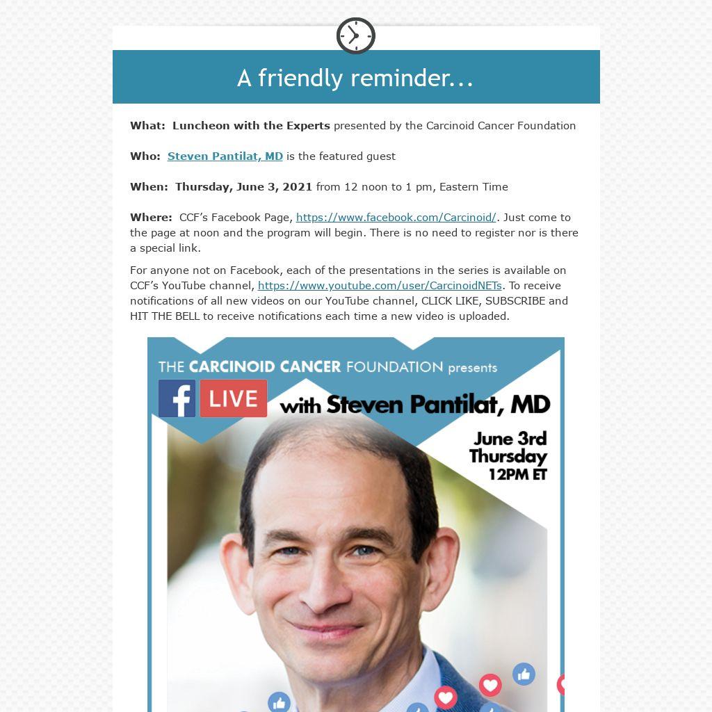 Where: CCF’s Facebook Page, https://www.facebook.com/Carcinoid/. Just come to the page at noon and the program will begin. There is no need to register nor is there a special link.