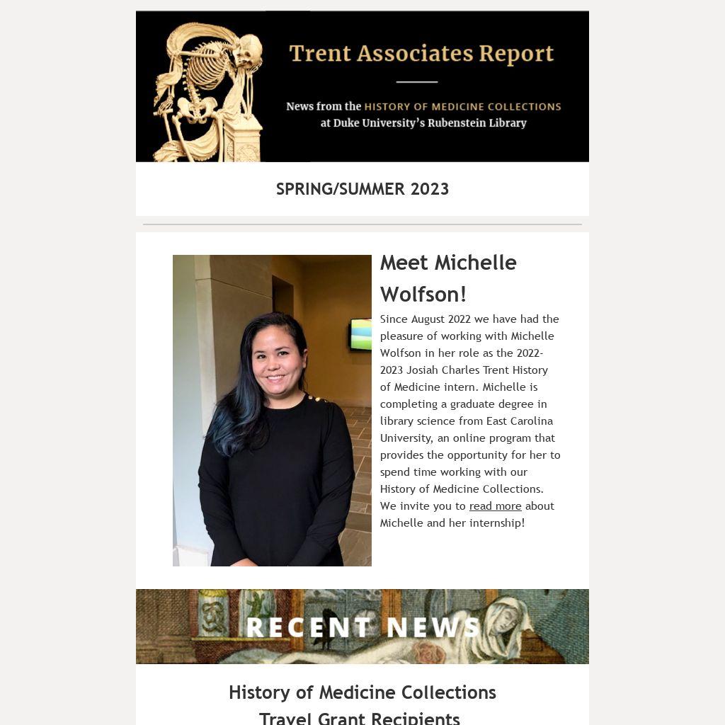 Since August 2022 we have had the pleasure of working with Michelle Wolfson in her role as the 2022-2023 Josiah Charles Trent History of Medicine intern. Michelle is completing a graduate degree in library science from East Carolina University, an online program that provides the opportunity for her to spend time working with our History of Medicine Collections. We invite you to read more about Michelle and her internship!