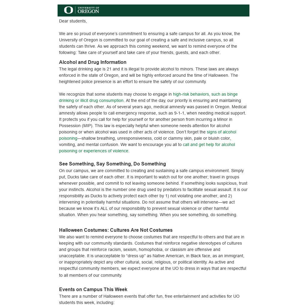 We are so proud of everyone’s commitment to ensuring a safe campus for all. As you know, the University of Oregon is committed to our goal of creating a safe and inclusive campus, so all students can thrive. As we approach this coming weekend, we want to remind everyone of the following: Take care of yourself and take care of your friends, guests, and each other.