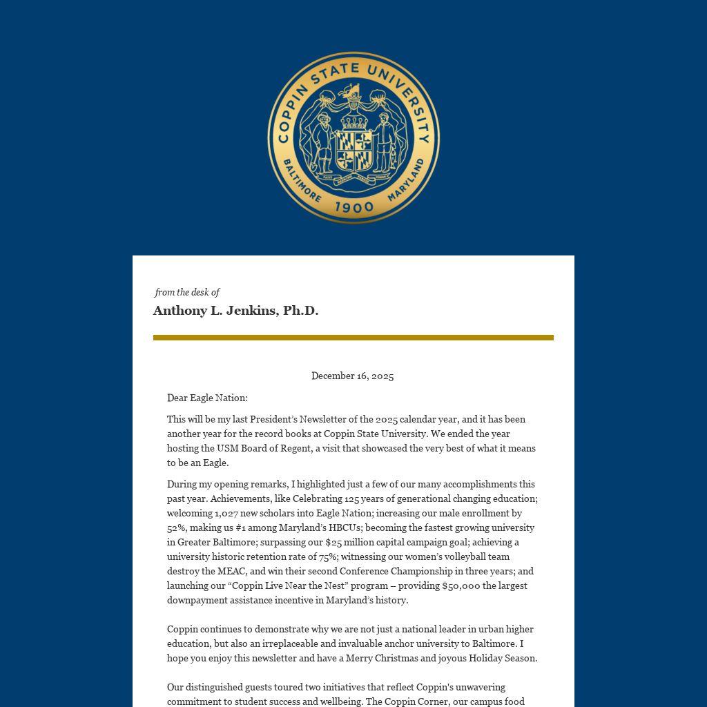 This will be my last President’s Newsletter of the 2025 calendar year, and it has been another year for the record books at Coppin State University. We ended the year hosting the USM Board of Regent, a visit that showcased the very best of what it means to be an Eagle.
