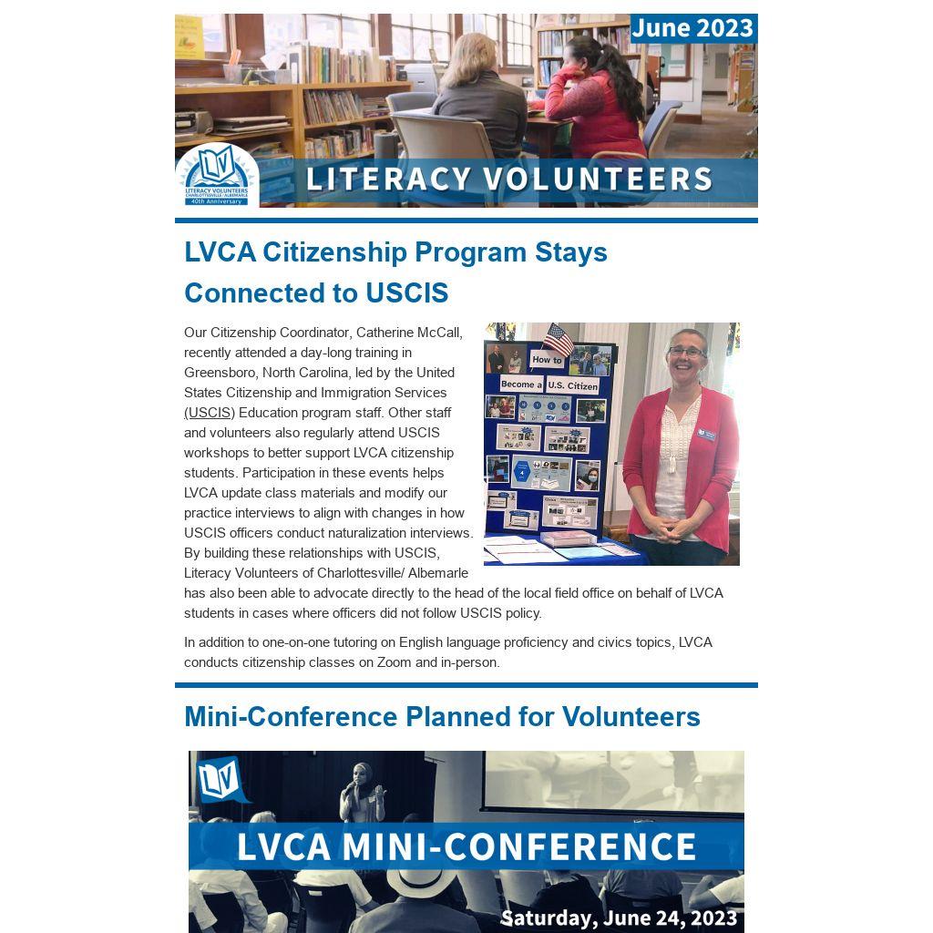 The staff is busy planning the annual summer Mini-Conference, which is an opportunity for LVCA tutors to come together and share their experiences with each other. All tutors are invited to a day of professional development and in-service training on Saturday, June 24, from 9 am to 3 pm. The mini-conference will feature a variety of instructional and informational workshops led by LVCA staff, volunteers, and guests from partner organizations. The event will be held at the Center at Belvedere, and we are requesting a $20 contribution for volunteers to cover the cost of a continental breakfast from Bodo's Bagels and lunch from Feast.