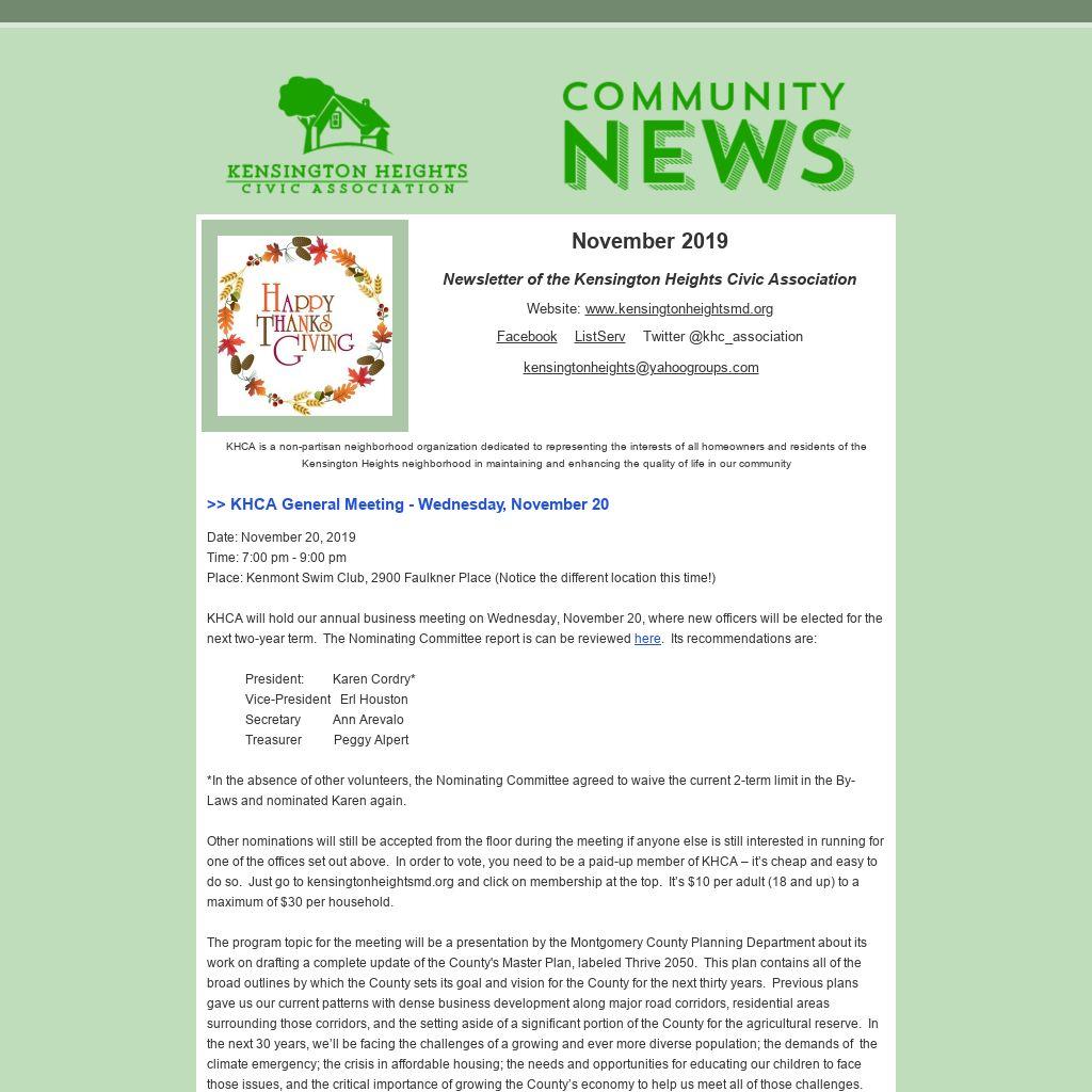 Things are reasonably quiet for KHCA so we think it’s time we revitalized a system we used to have in the old days (pre-email!) when we hand-delivered newsletters to our neighbor through block captains who took responsibility for talking to all of the neighbors, getting their contact information, and making sure they knew about KHCA and, oh yes, dropping off newsletters. We want to get back to the same system of making sure we have contact with everyone since there are way too many folks who still don’t know there even is a Kensington Heights Civic Association. So, once the holidays are over, don’t be surprised if we invite you to be the captain on your block. And, we want to have a Membership Committee to help us spearhead this effort – if you’re the one who loves to meet everyone, or if you’re just the type who’s good at details, we can use both of you. Contact Karen Cordry to volunteer as a block captain or join the Membership Committee.