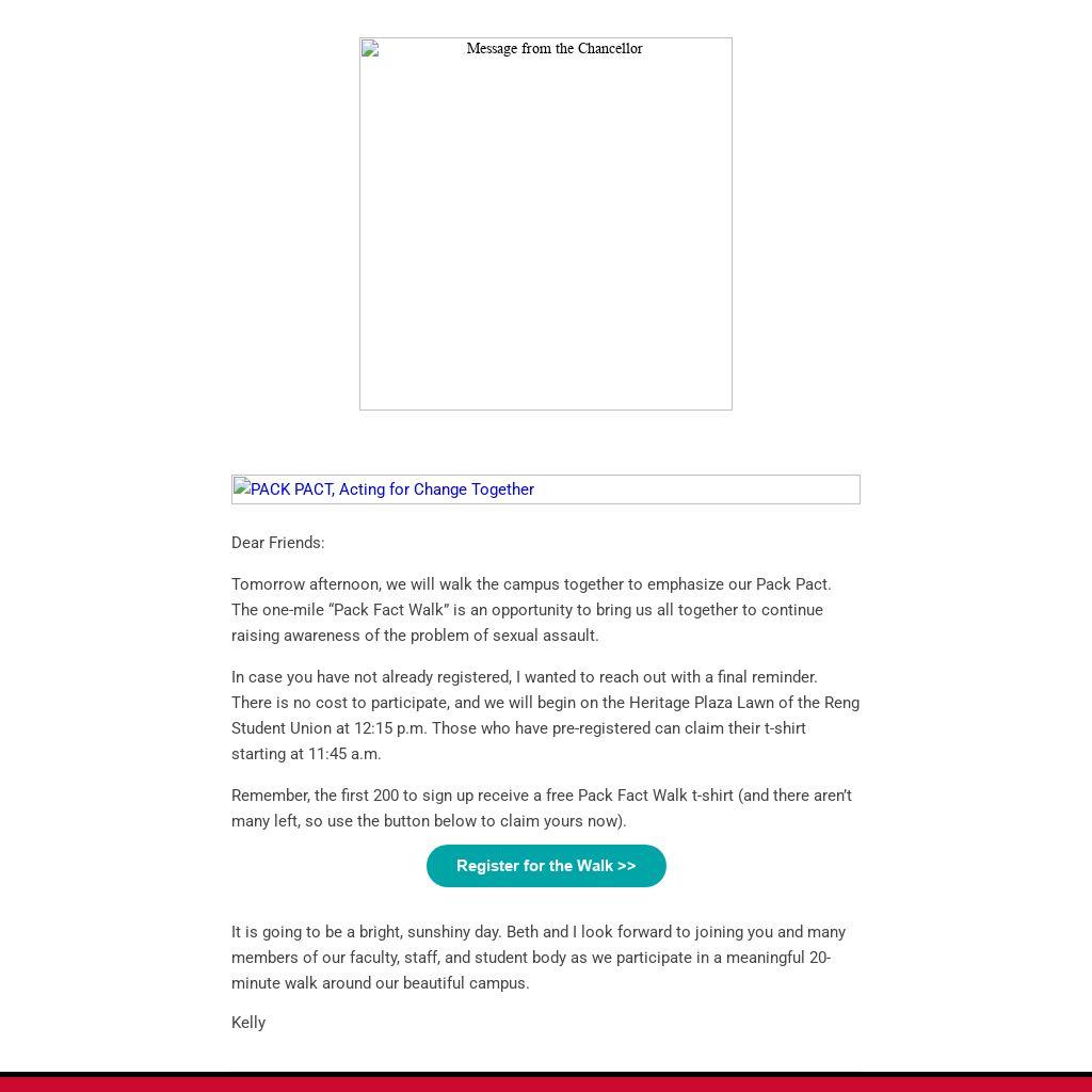 Tomorrow afternoon, we will walk the campus together to emphasize our Pack Pact. The one-mile “Pack Fact Walk” is an opportunity to bring us all together to continue raising awareness of the problem of sexual assault.