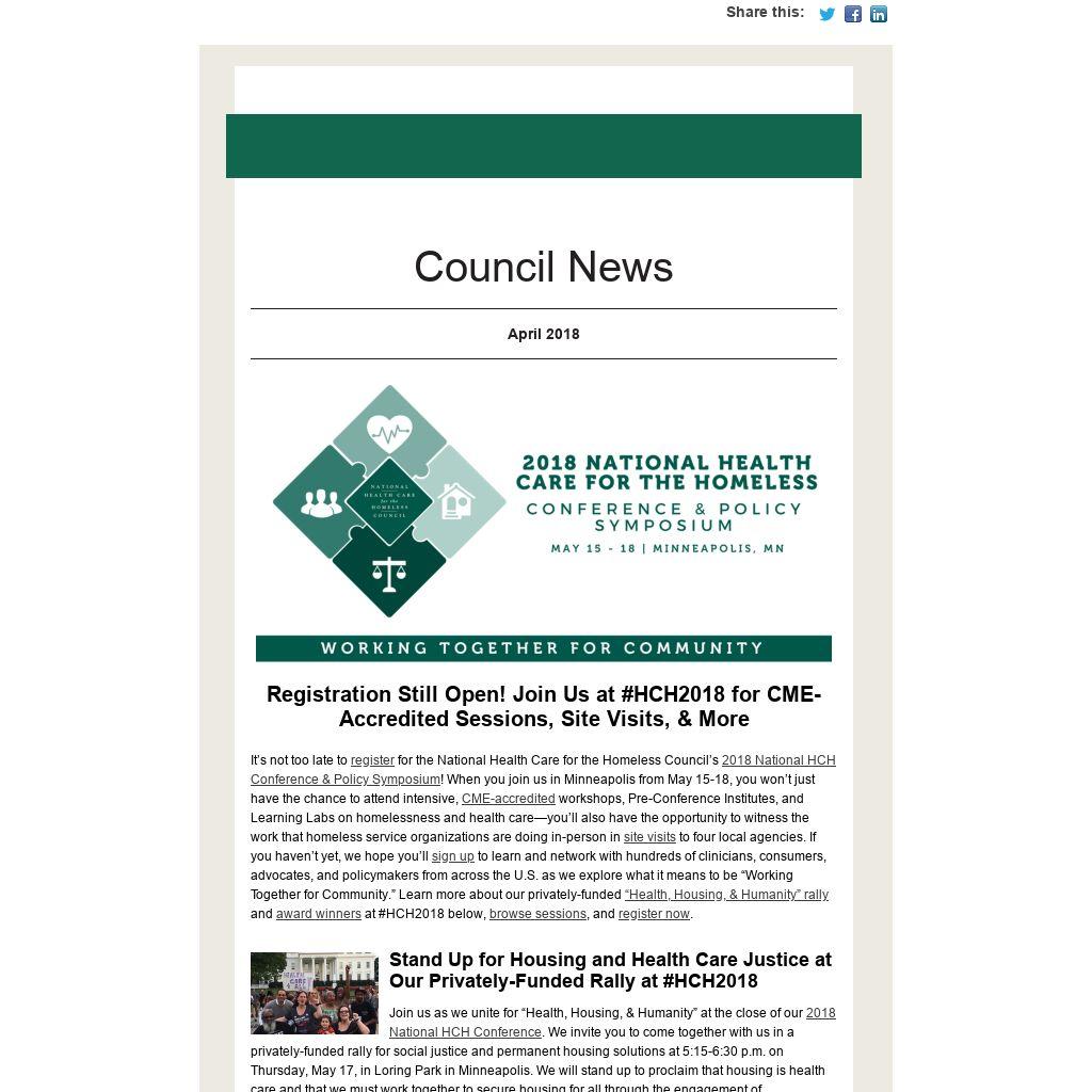 | Announcing Our #HCH2018 Award Winners The National HCH Council is pleased to announce the five individuals and organizations to be honored at the Awards Lunch of our 2018 National HCH Conference from 11:15 a.m.-12:45 p.m. on Thursday, May 17, in the Nicollet Ballroom of the Hyatt Regency Minneapolis. Learn more about the honorees, which include John Parvensky of the Colorado Coalition for the Homeless, Asma Inge-Hanif of Muslimat Al Nisaa Shelter, Jacquelyn Hardy of Alabama Regional Medical Services, Dean Williams of Neighborcare Health, and the Fargo-Moorhead Medical Respite Planning Committee. Congratulations to our awardees, and thank you to everyone who submitted a nomination.