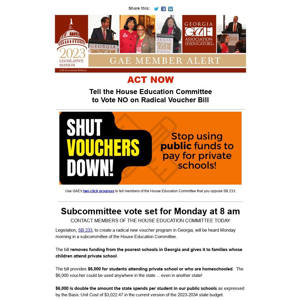 Legislation, SB 233, to create a radical new voucher program in Georgia, will be heard Monday morning in a subcommittee of the House Education Committee.