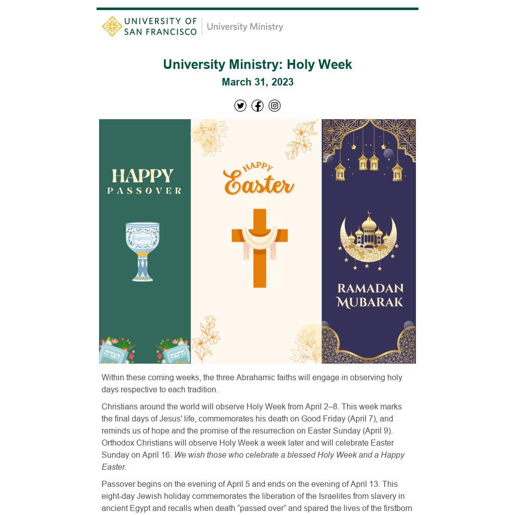 Christians around the world will observe Holy Week from April 2–8. This week marks the final days of Jesus' life, commemorates his death on Good Friday (April 7), and reminds us of hope and the promise of the resurrection on Easter Sunday (April 9). Orthodox Christians will observe Holy Week a week later and will celebrate Easter Sunday on April 16. We wish those who celebrate a blessed Holy Week and a Happy Easter.