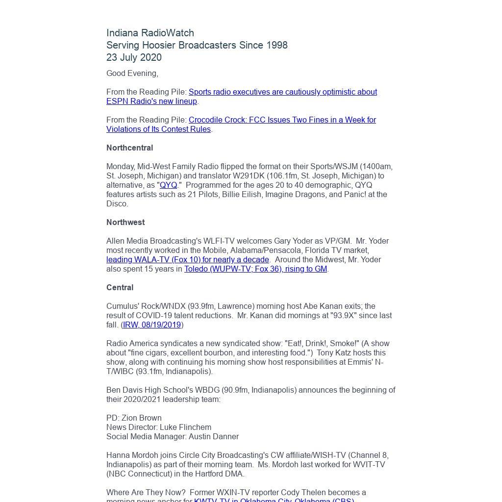 Indiana RadioWatch subscriptions are free. To subscribe, send an e-mail to irw@well.com and we'll add you. After publication, we archive Indiana RadioWatch on the Indiana Radio Archive at indianaradio.net. Please e-mail us your news stories and employment opportunities.