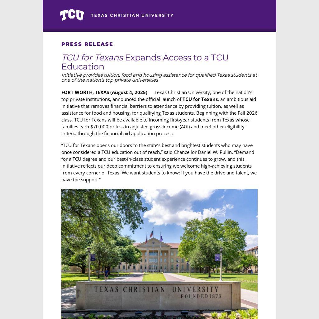 FORT WORTH, TEXAS (August 4, 2025) — Texas Christian University, one of the nation’s top private institutions, announced the official launch of TCU for Texans, an ambitious aid initiative that removes financial barriers to attendance by providing tuition, as well as assistance for food and housing, for qualifying Texas students. Beginning with the Fall 2026 class, TCU for Texans will be available to incoming first-year students from Texas whose families earn $70,000 or less in adjusted gross income (AGI) and meet other eligibility criteria through the financial aid application process.